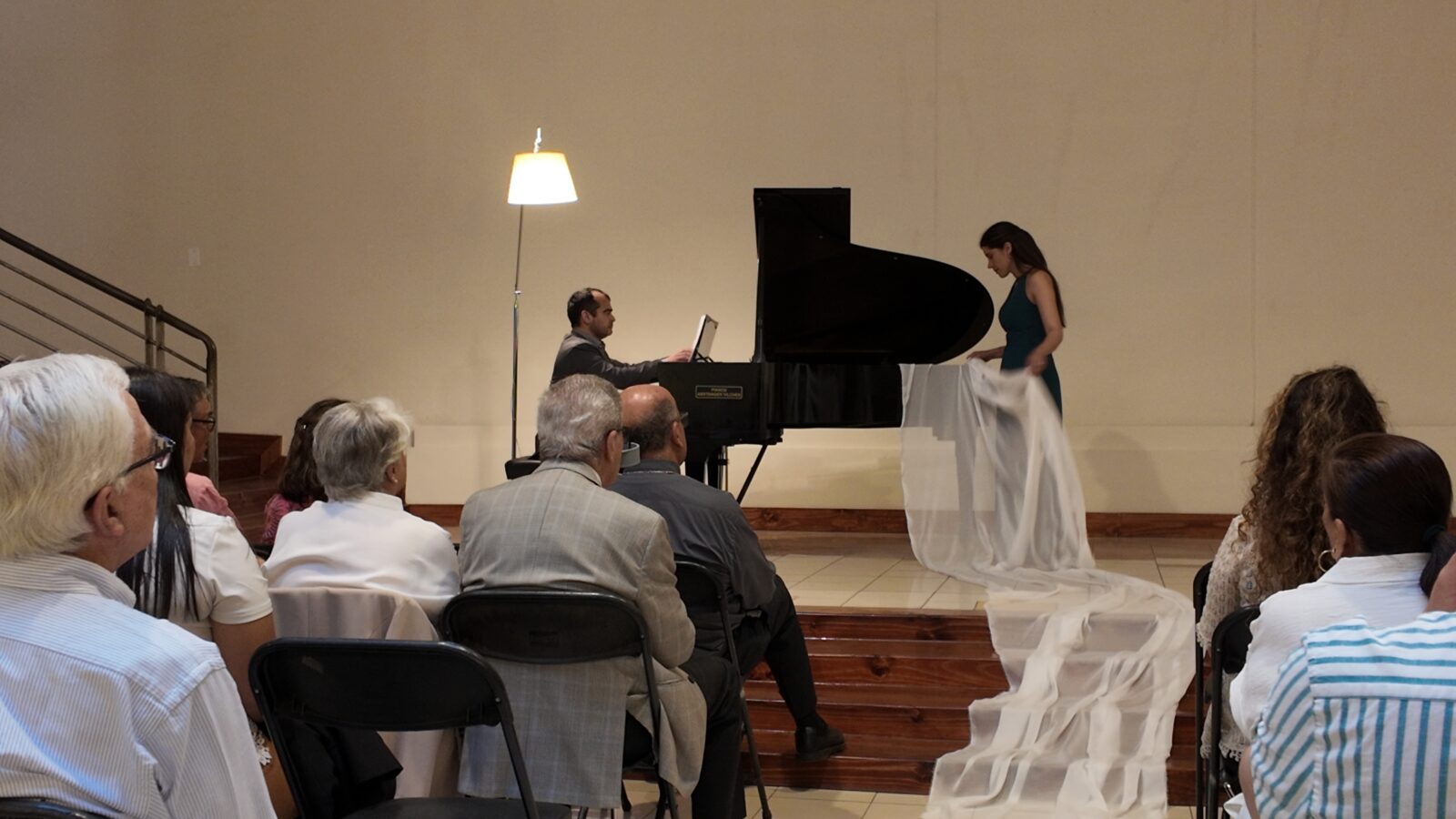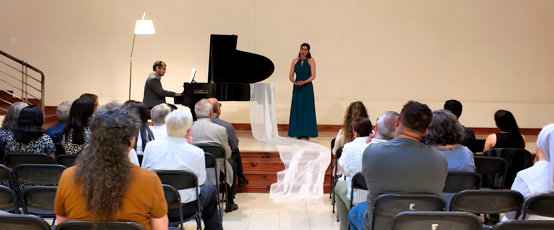 El concierto estuvo a cargo de la soprano Natalia Vilches y el pianista y compositor Simón Morgado, ambos reconocidos por su trabajo en la difusión de la Canción de Arte Iberoamericana y por su extensa investigación musical en torno a la obra de Gabriela Mistral. A través de un delicado recorrido por textos mistralianos, especialmente aquellos dedicados a la infancia, el dúo ofreció una interpretación profundamente emotiva que conmovió a los presentes.